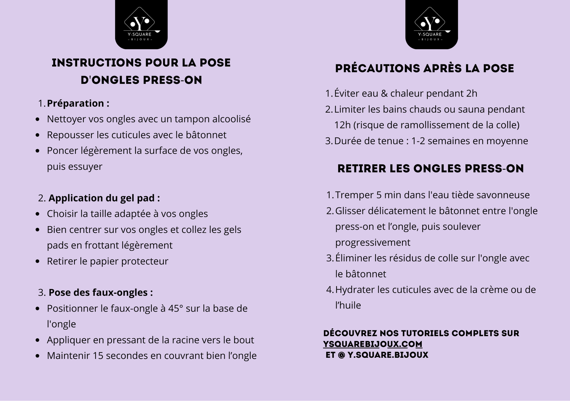 Pour un ajustement parfait, nous vous recommandons de suivre notre Guide des tailles et nos instructions "Comment mesurer avec du ruban adhésif" afin de choisir la bonne taille d'ongles.